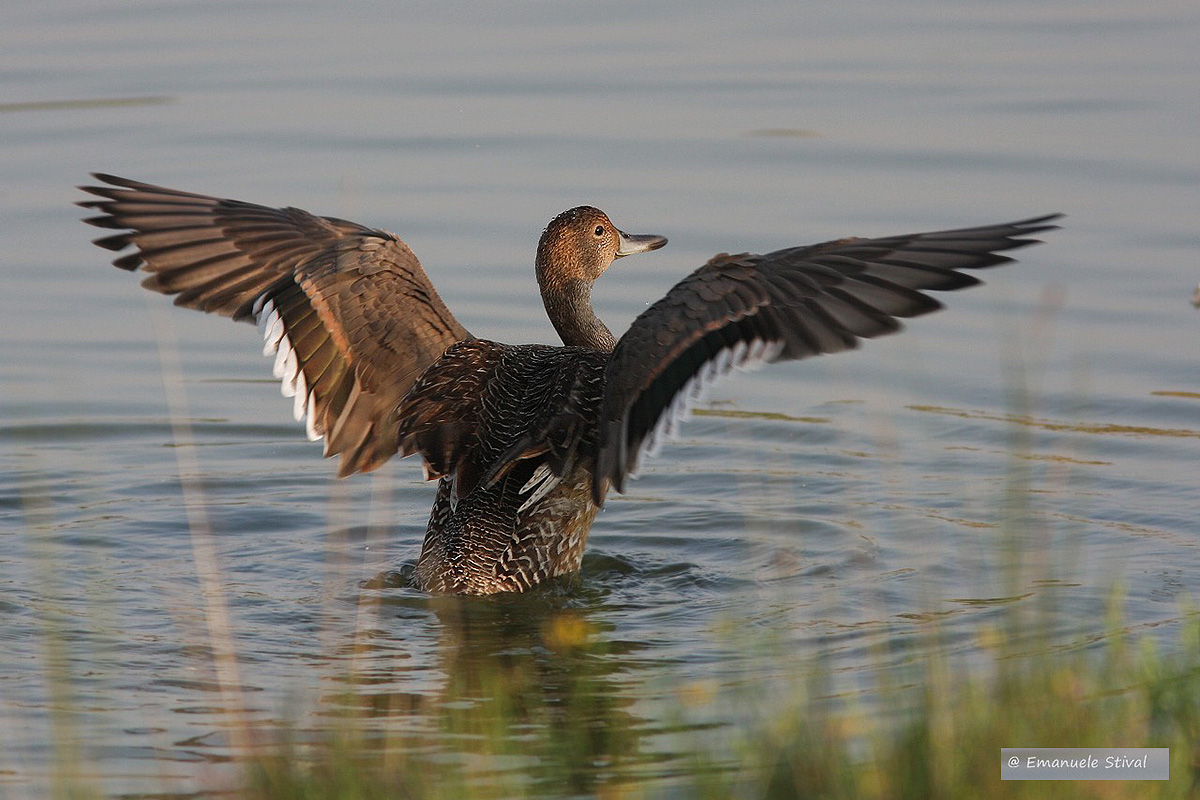 maschio (in primo piano) con mestoloni, volpoche, alzavole, cormorani e aironi bianchi maggiori, febbraio