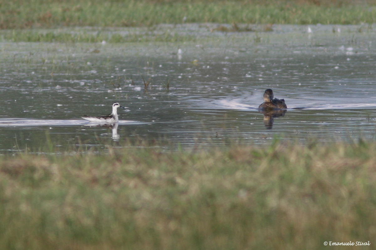 falaropo beccosottile in abito invernale con alzavola, settembre