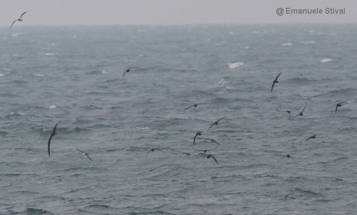 | Vari individui in volo nel loro habitat assieme ad una berta maggiore (a sinistra); in alto a sinistra un gabbiano. |