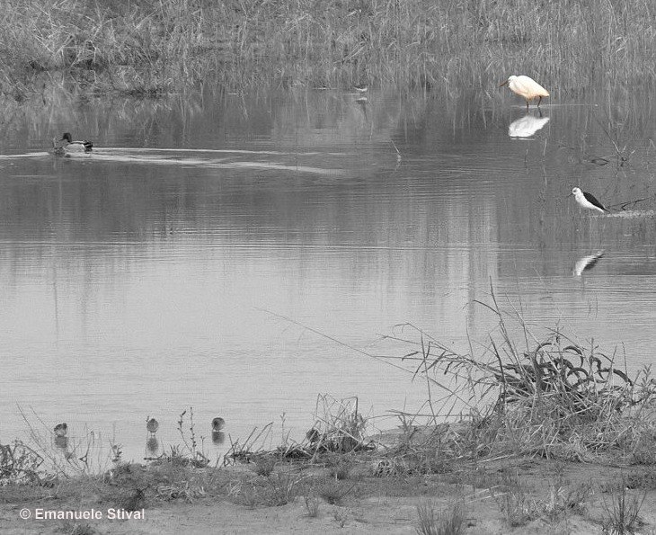 (a destra), alcuni limicoli (in basso e vicino alla garzetta) e una coppia