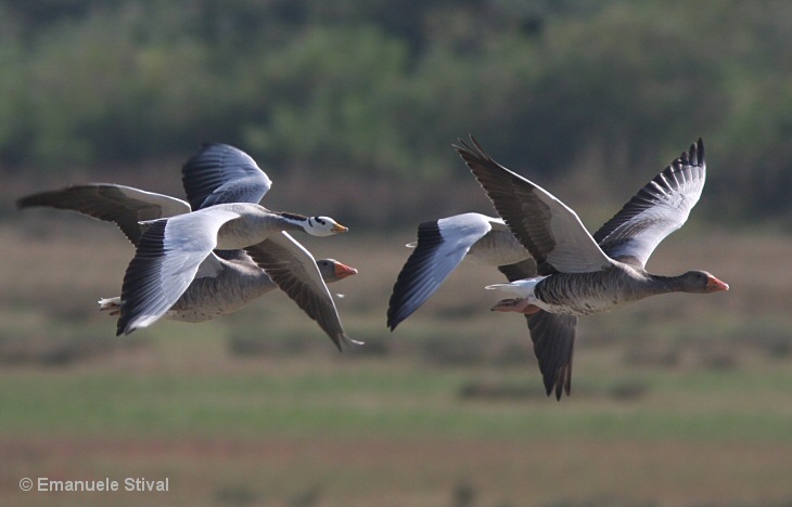 | Due oche selvatiche in volo assieme a due oche indiane (una in primo