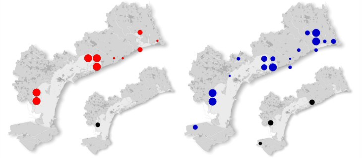 nidificazione, a destra quello di svernamento (2007-2012); in bianco e